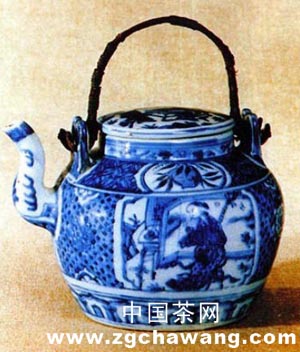 這件青花提梁茶壺,是明萬歷年間景德鎮(zhèn)民窯燒造的。青花色調(diào),藍中泛紫。畫面圖案繁密,用筆粗獷,布局繁亂。瓷胎質(zhì)地較粗,胎體