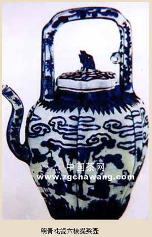 這件明青花瓷六棱提梁壺,紋飾布局較繁亂,云氣紋、人物、松林及蕉葉紋等繪畫風(fēng)格繁縟麻密,幼稚滯拙。青花發(fā)色灰暗昏散。壺的造