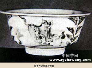 這件青花瓷乳虎紋茶碗,大約是15世紀時明代景德鎮(zhèn)民窯產(chǎn)的飲茶用具。該碗裝飾畫面用線活潑,縱筆揮灑,給人一種新鮮活潑的美感。