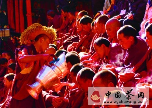 第十一世班禪坐床10周年慶典活動的喇嘛提供齋茶、齋飯 寺院僧侶是藏族社會最早飲茶的群體之一 早先,由于茶葉得之不易,所