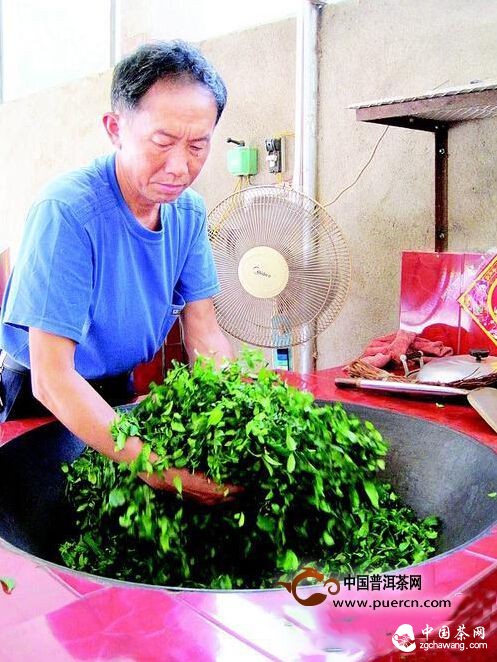 正在炒茶的茶農(nóng)叫駱志輝,他正將茶青倒入燒熱的鍋爐中,徒手進(jìn)行殺青。駱志輝是個(gè)炒茶能手,這一批茶葉還未下鍋前,就已經(jīng)被人提前預(yù)定了。鍋爐下的爐膛里,幾根柴火被燒得滋滋作響,駱志輝用手感觸著鍋爐和茶葉的溫度,火燒得不夠旺時(shí),不時(shí)吩咐妻子在一旁加柴火。“茶葉采摘回來后,經(jīng)過簡(jiǎn)單的吹干水分,就要進(jìn)入加工制作環(huán)節(jié)。制作分殺青、揉捻、烘青、復(fù)揉、干燥等5道工序,整個(gè)過程需花費(fèi)5個(gè)小時(shí),都是手工操作。我們用的是柴火,惟一用到的機(jī)械就是半手工操作的揉捻機(jī)。”駱志輝說。