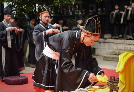 4月6日,身著漢服的祭祀者在進(jìn)行參神。祭祀者以茶祭祀,并誦讀王陽(yáng)明的名作《教條示龍場(chǎng)諸生》,緬懷先賢。
