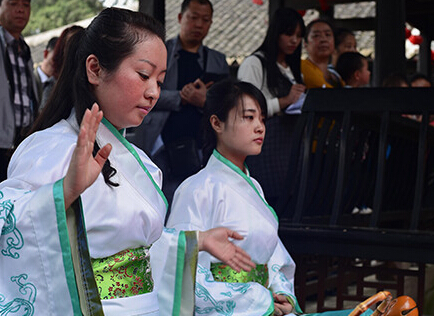 4月6日,身著漢服的祭祀者在進(jìn)行參神。當(dāng)日,由貴陽(yáng)市旅游發(fā)展委員會(huì)主辦的“丙申年清明·茶祭王陽(yáng)明、尹道真典禮 ”在貴陽(yáng)市東山陽(yáng)明祠舉行,來(lái)自貴陽(yáng)市各界數(shù)百人參加了祭祀典禮。祭祀者以茶祭祀,并誦讀王陽(yáng)明的名作《教條示龍場(chǎng)諸生》,緬懷先賢?!∴嵈蝴悺z