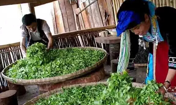 云南大葉種茶鮮葉—攤涼—殺青—揉捻—曬干—潮水—渥堆發(fā)酵