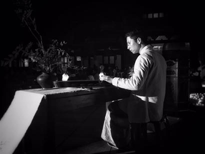 由上定下空大和尚帶領(lǐng)十二位茶人,共同點(diǎn)燈進(jìn)入內(nèi)場,隨三聲罄響入座,行草鞋圈后,奉茶飲茶,三巡兩輪,再坐香靜思,打警策歇止。
