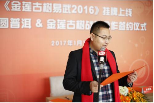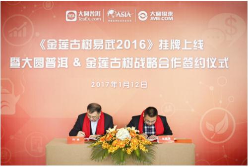 1月12日,金蓮古樹易武2016掛牌上線暨戰(zhàn)略合作簽約儀式在南京舉行,大圓普洱交易中心(簡稱“大圓普洱”)總裁葉林、勐海金蓮古樹茶業(yè)有限公司(簡稱“金蓮古樹”)總經(jīng)理林鵬鋒等參加了本次活動。金蓮古樹也成為大圓普洱第25家茶企合作伙伴。