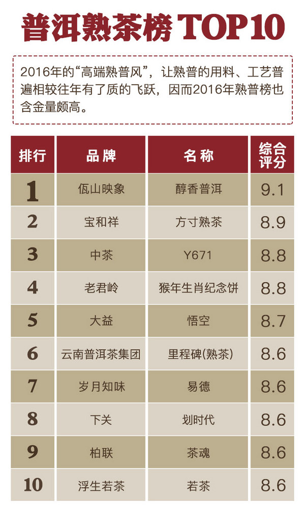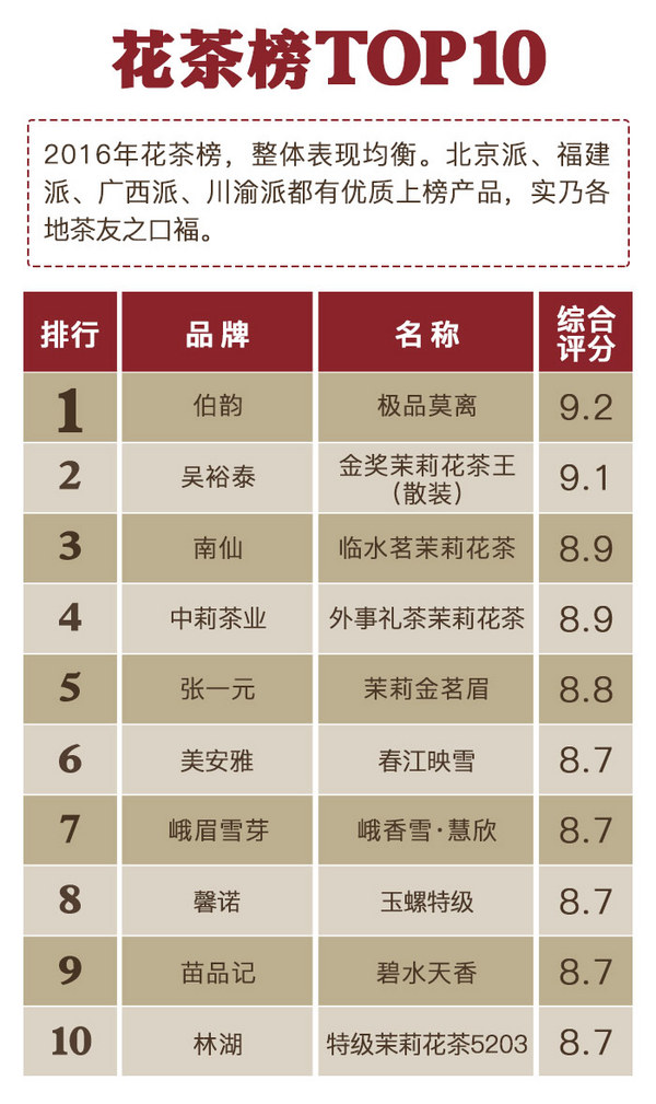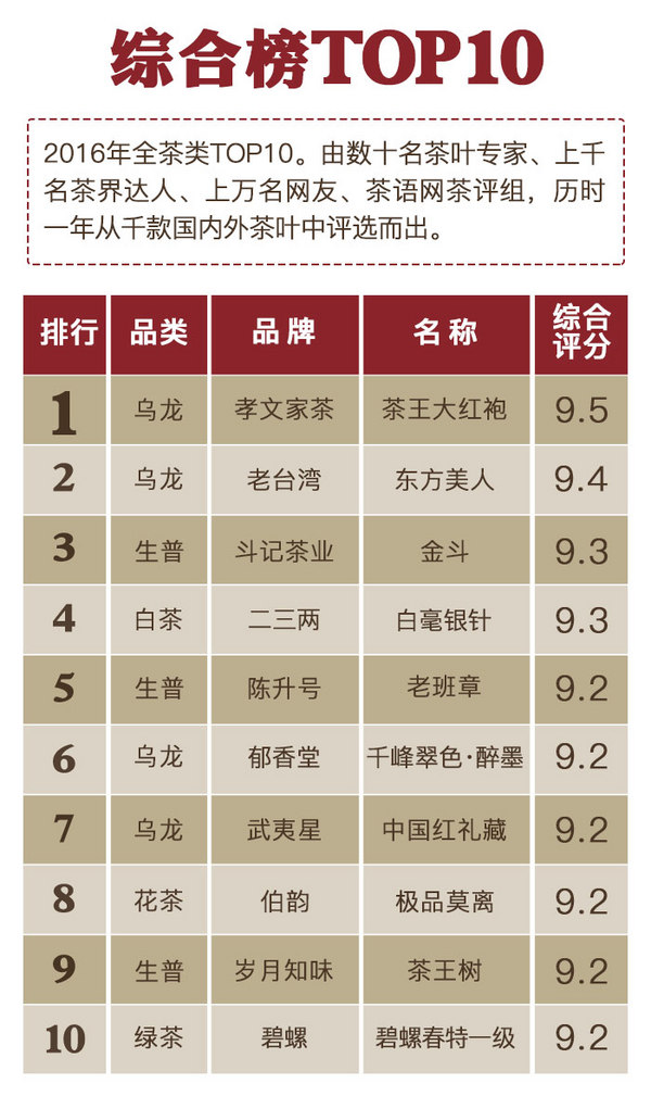 因?yàn)楸疚钠邢?,更?ldquo;2016年千款茶評(píng)榜”詳情(包括專(zhuān)家評(píng)分、達(dá)人評(píng)分、上榜理由、茶評(píng)等細(xì)節(jié)),請(qǐng)點(diǎn)擊文末閱讀原文進(jìn)入“2016年千款茶評(píng)榜”專(zhuān)區(qū)查看。