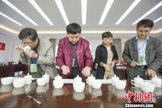 4月23日,專家評委在鄱陽湖茶葉產(chǎn)區(qū)茶王爭霸賽上評茶?!「到ū蟆z