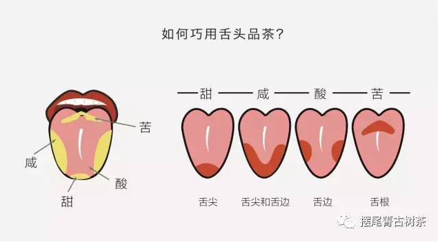 舌頭是人體的味覺器官,各部分的味蕾對不同味感的感受能力是不一樣的。舌尖主要感受茶葉的“甜味”;舌的兩側(cè)前端主要感受茶的醇和度;舌兩側(cè)的后端主要感受普洱茶的“酸味”;舌心主要感受普洱茶的“澀味”;舌根則重點體會普洱茶的“苦味”。