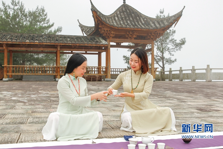 7月7日,在武夷山齊云峰頂,擺茶姑娘在品茗。新華網(wǎng)發(fā)(邱汝泉 攝)