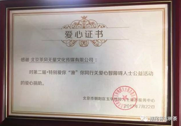 2017年7月22日,北京茶風(fēng)無(wú)量文化傳媒有限公司作為愛心企業(yè)參與了第二屆•特別愛你“漁”你同行關(guān)愛心智障礙人士公益活動(dòng),炎炎夏日里送去了擺尾箐古樹茶禮。無(wú)論是關(guān)愛心智障礙的孩子們,還是為寧洱縣梅子鎮(zhèn)的小學(xué)生們送文具,擺尾箐古樹茶始終用實(shí)際行動(dòng)關(guān)愛下一代。
