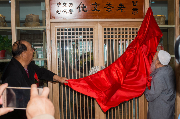 甘肅省委原副書記、甘肅省少數(shù)民族文化教育促進(jìn)會(huì)會(huì)長禹貴民(左)與中國著名書畫家馬西園為甘肅老茶文化品鑒交流中心揭牌