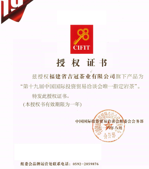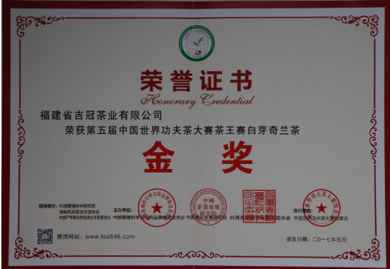 吉冠茶業(yè)是“第19屆中國(guó)國(guó)際投資貿(mào)易洽談會(huì)唯一指定巖茶”,為來(lái)自海內(nèi)外的貴賓提供純正的武夷巖茶服務(wù)。同時(shí)榮獲“第五屆中國(guó)世界功夫茶大賽茶王賽白芽奇蘭茶金獎(jiǎng)”稱號(hào),而且吉冠還是漳州片仔癀指定唯一的“白芽奇蘭茶”品牌合作生產(chǎn)商,產(chǎn)品在片仔癀全國(guó)的體驗(yàn)館內(nèi)均有銷售,其育茶、制茶工藝已經(jīng)非常成熟,引領(lǐng)行業(yè)先鋒。