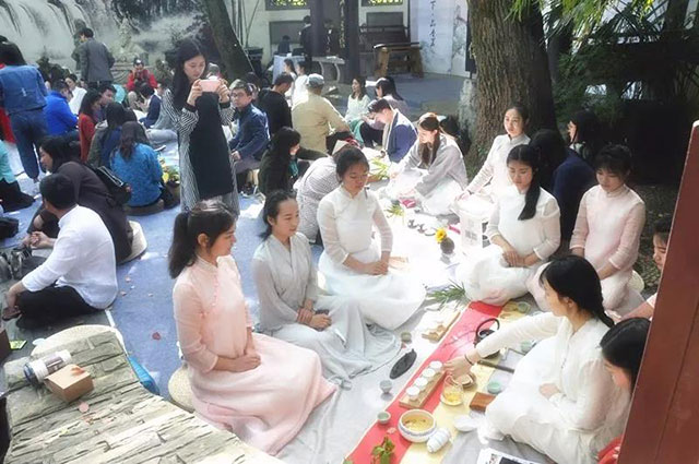 臨江望水,席地而坐,于裊裊茶煙中聞香、賞花、談天說地,一曲《流水》、一支禪舞,更平添幾分意境。相識的、不相識的一群人因茶而聚,舉杯共飲的神色里,仿佛久別重逢的故人,多么奇妙的感覺。