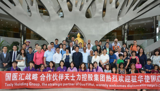 2018年5月18日上午,19個國家近50名外國駐華大使、公使、總領(lǐng)事等高級別外交官及家人組成的考察團(tuán)參觀考察了天士力帝泊洱生物茶谷。北京外交人員服務(wù)局常務(wù)副局長蔣琪、云南省人民政府外事辦公室副主任夏劍鋒、普洱市副市長胡劍榮、天士力控股集團(tuán)董事局主席閆希軍、總裁吳迺峰等領(lǐng)導(dǎo)陪同考察。