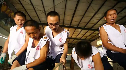 吆喝,是力與美的展現(xiàn)。在千兩茶踩制過程中,漢子們唱著千兩號子,喊著口號,這是梅山文化中儺戲的經(jīng)典形式。吆喝聲,力量雄渾,粗狂豪邁,顯示了人們對力量的向往,展示了原始淳樸之美。代表著人們,希望強大自身,過上美滿生活的愿望。