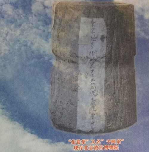 卷首,是一張以故宮博物院為背景的,千兩花卷圖片。茶體上有“茶字25號樹形花卷共兩塊每塊重十X”的字樣,書中標注為“花卷茶”又名“千兩茶”,現(xiàn)存北京故宮博物院。