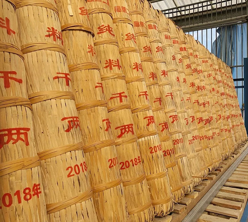 千兩茶以篾簍為外包裝,內(nèi)貼棕片、蓼葉。在踩制過程中,蓼葉的葉脈,以及葉與葉交接之處的痕跡,都會深深的刻在茶體上,形成不規(guī)則的花紋。