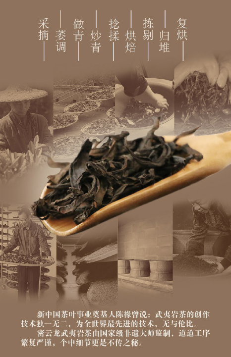 如今現(xiàn)代密云龍,鮮葉采摘茶葉為一芽三葉。以中開面為標(biāo)準(zhǔn),采摘三葉嫩梢及采摘層上的幼嫩對(duì)夾葉,合格的密云龍武夷巖茶茶菁肥壯、完整。采摘結(jié)束后由國(guó)家非物質(zhì)文化遺傳傳統(tǒng)人葉啟桐葉老再經(jīng)過(guò)萎凋、殺青、揉捻、初烘再到揀剔、炭焙等多道傳統(tǒng)工藝精制而成。