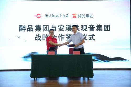 醉品集團(tuán)CEO葉翱(左)與福建安溪鐵觀音集團(tuán)總裁夏建平(右)簽訂戰(zhàn)略合作協(xié)議
