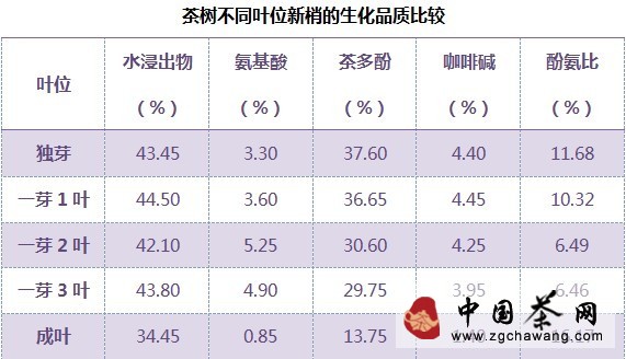 生產(chǎn)上,除成葉外, 其他不同葉位的茶樹新梢所制茶葉的生化品質(zhì)都比較優(yōu)良, 但它們彼此間的生化品質(zhì)仍存在差異, 并出現(xiàn)規(guī)律性的變化趨勢(如下表所示)。酚氨比通常用來衡量茶葉滋味的醇度( 鮮醇、不澀、爽口) , 酚氨比較小者, 茶湯醇度較好, 滋味鮮醇。綜合分析不同葉位的茶葉中水浸出物、氨基酸、茶多酚、咖啡堿、酚氨比等生化品質(zhì)指標(biāo)可以看出,以一芽2葉新梢茶葉作為原料時(shí)其生化品質(zhì)最優(yōu), 其次是一芽1 葉和獨(dú)芽, 而成葉的生化品質(zhì)最差。