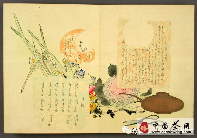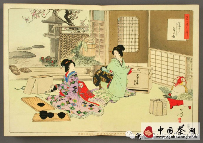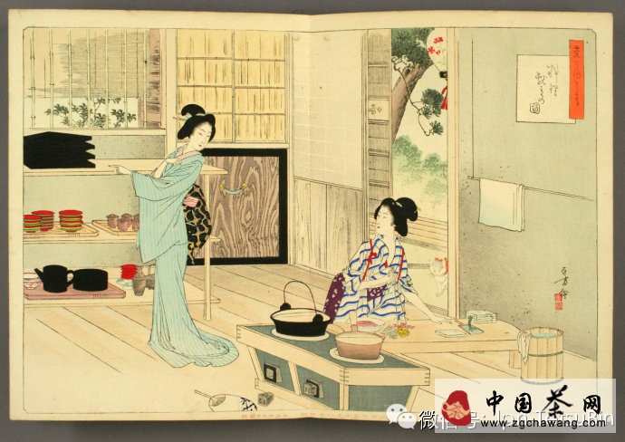《茶の湯日々草》一小冊,明治29-30(1896-1897)年印刷的折頁彩繪,繪者水野年方,畫的內(nèi)容是日人之日常茶事情形,其首有谷村宗夕氏小序,云可為婦人修習(xí)茶道的入門手冊。頗堪玩味,遂發(fā)圖于此與諸君共賞。