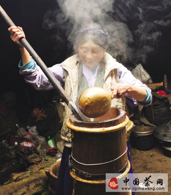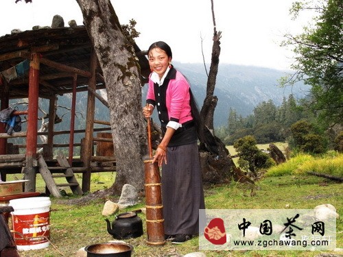 制法:①在鍋內(nèi)注入清水,煮沸后放入敲碎了的茶。熬煮半小時,使茶汁浸出。②濾去茶渣,將熱茶汁倒入打茶桶,再放入酥油及適量的鹽和糖。③最最關(guān)鍵的打茶,輕提重壓,反復(fù)數(shù)十次。當(dāng)“咣當(dāng)、咣當(dāng)”變成“嚓伊、嚓伊”的時候就表示你的酥油茶做好了。④轉(zhuǎn)裝進(jìn)茶壺中再分到茶碗內(nèi),即可飲用。