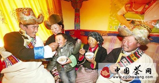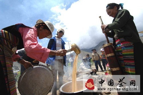 西藏人本不飲茶,文成公主進(jìn)藏時將漢人的飲茶習(xí)慣帶去了西藏,經(jīng)過當(dāng)?shù)厝孙嬍沉?xí)慣的融匯演變,逐漸形成了現(xiàn)在風(fēng)味獨(dú)特的藏族酥油茶。酥油茶營養(yǎng)豐富,即可驅(qū)寒、充饑,又可消除疲勞、提神醒腦、補(bǔ)充養(yǎng)分,因此,藏族同胞喝茶的量大得驚人,普通的每天都要有30~40杯,從事體力勞動的人則更濃更多。藏族同胞喝酥油一般茶早中晚各一次,早茶飲過數(shù)杯后,最后一杯時留下一半的茶,加入炒熟的青稞粉,調(diào)成糊狀或捏成團(tuán)裝食用,俗稱糌粑。午餐、晚餐也是這樣,成為一種茶飯不分的飲食習(xí)慣。