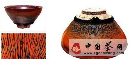 第六類:雜色釉。由于建窯黑釉器系“窯變”所致,故釉面紋理變化多端,除上述五大類釉面紋理之外,還有一些雜色釉,如柿紅色、赤紅色、醬釉(醬綠釉、醬黑釉、醬黃釉)等。有的文章中提到的“灰白釉”、“芝麻花”、“結(jié)晶冰花紋”、“龜裂紋”等雜色釉,筆者認(rèn)為都是火候不夠高的次品(生燒或半生燒品)。建窯黑釉器必須在1200℃多度的高溫中方能燒成正品。此外,“鐵銹斑”紋的定名問題還有待陶瓷界進一步研究、確定。