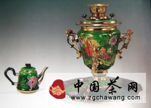 俄羅斯茶具最有名的是銅茶炊,俄羅斯的第一批銅茶炊是在18世紀(jì)初問世的。茶炊的主要產(chǎn)地在圖拉市,因此有“茶炊之都”的美稱。俄式茶炊是從蒙古人所用的火壺發(fā)展而來,這種茶炊下部有爐火,而且插在中部的一根內(nèi)管可以保持水溫。很濃的茶是在位于頂部的小茶壺中泡制的,并且可通過壺側(cè)的水龍頭中的熱水進(jìn)行稀釋。俄式茶炊可保持茶溫好幾個(gè)小時(shí),并且時(shí)刻能為任何數(shù)目的家庭成員和客人提供準(zhǔn)備好了的茶水。在以前的俄國,無論貧富,每一個(gè)家庭里都有茶炊,即使出門旅行也隨身帶著它。