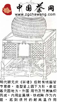朱元璋的十七皇子朱權精于習茶。他對廢除團茶后新的品飲方式進行了探索 和研究,還改革了傳統(tǒng)的品飲方法和飲茶用具,提倡習茶從簡,首開“清飲”的 風氣。在朱權所著的茶學著作《茶譜》中,他就改進茶器具等多方面一一論述, 還創(chuàng)造出了 “茶灶”這一茶器,將其以藤或竹包扎,稱之為“苦節(jié)君”,寓意 “逆境守節(jié)”,也表現出了茶的一大品格。
