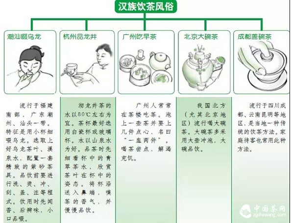 我國(guó)地域遼闊,人口眾多,民族眾多,自古以來(lái)就有以茶待客、以茶會(huì)友等風(fēng)俗。自古代流傳下來(lái)的飲茶習(xí)俗至今依然可見(jiàn),形成了獨(dú)特的茶文化。各地飲茶的風(fēng)俗習(xí)慣大體可分為:一、講究清飲法(即追求茶之原味)的飲茶風(fēng)習(xí)。我國(guó)綠茶、花茶、普洱茶、烏龍茶等均屬此列。二、講求調(diào)飲法(即茶湯中加以佐料)的飲茶風(fēng)習(xí)。我國(guó)少數(shù)民族的酥油茶、鹽巴茶、打油茶等屬于此列。三、品飲時(shí)講究環(huán)境的多重享受。飲茶時(shí),欣賞詩(shī)詞書畫、歌舞戲曲并配以點(diǎn)心、佐料。漢 族的清飲法 漢族推崇清飲,認(rèn)為品飲茶的清湯最能體現(xiàn)茶的特質(zhì)。方法是用開(kāi)水直接沖泡茶葉,不加任何佐料。各地清飲方式不同,大體可分為:潮汕啜烏龍、品西湖龍井、廣州吃早茶、北京大碗茶、成都蓋碗茶等。