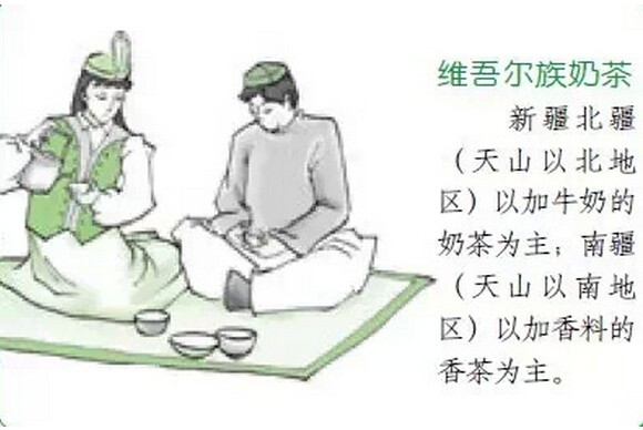 維 吾爾族的奶茶與香茶 新疆的北疆(天山以北地區(qū))主要以加牛奶的奶茶為主;南疆(天山以南地區(qū))主要以加香料的香茶為主,所以茶品均為茯磚茶。