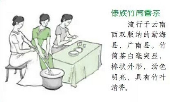 傣 族、拉祜族的竹筒香茶 竹筒香茶為傣族與拉祜族獨(dú)有的一種茶飲料。因原料細(xì)嫩,又名“姑娘茶”,產(chǎn)于云南西雙版納傣族自治州的勐??h。其制法有兩種:一是采摘細(xì)嫩的一芽二三葉,經(jīng)殺青、揉捻,裝入嫩甜竹筒內(nèi);另一種方法是將毛尖與糯米一起蒸,茶葉軟化后倒入竹筒內(nèi)。茶葉因此具有竹香、米香、茶香三味。