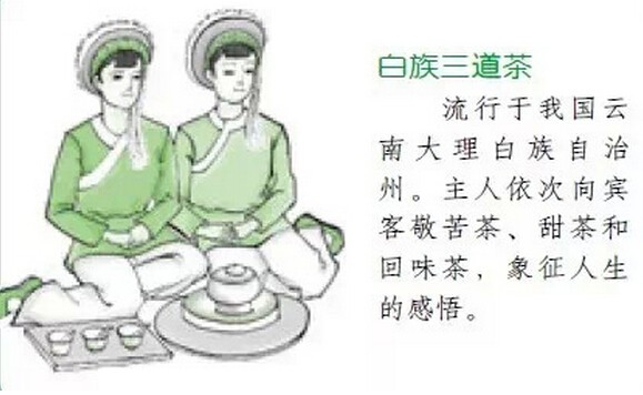 白 族三道茶 白族主要居住在我國(guó)云南大理白族自治州。不論過(guò)節(jié)、壽誕、婚嫁、賓客來(lái)訪等主人都會(huì)以“一苦二甜三回味”的三道茶來(lái)款待。主人依次向賓客敬苦茶、甜茶和回味茶,象征人生的感悟。