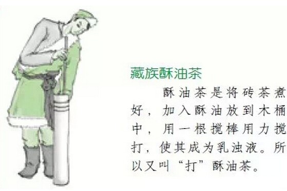 藏 族酥油茶 酥油茶是一種在茶湯中加入酥油等原料,再經(jīng)特殊方法加工而成的茶。西藏地處高原,空氣稀薄,氣候干燥,寒冷。酥油茶滋味多樣,既可暖身,又能增加抗寒力,對(duì)于藏族人民來(lái)說(shuō)有著比其他民族更為重要的作用。喝酥油茶很講究禮節(jié),客人來(lái)訪,主人會(huì)奉上糌粑,再遞上一只茶碗,按輩分大小逐個(gè)倒?jié)M酥油茶。在婚嫁中,藏族人視茶為珍貴禮品,其象征著美滿的婚姻。
