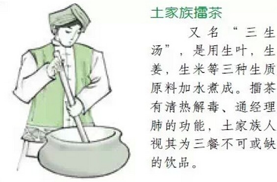 土 家族擂茶 土家族主要居住在我國(guó)的川、黔、鄂、湘四省交界地區(qū)。擂茶,又名“三生湯”,是用生葉、生姜、生米等三種生質(zhì)原料加水煮成。擂茶有清熱解毒、通經(jīng)理肺的功能,土家族人視其為三餐不可或缺的飲品。