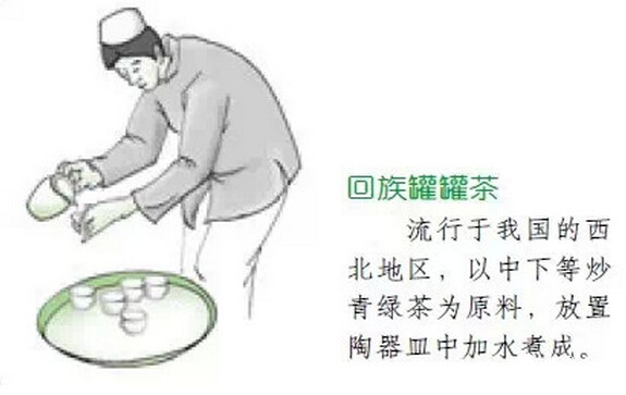 回 族罐罐茶 回族主要居住在我國(guó)的大西北,回族的罐罐茶以中下等炒青綠茶為原料,加水煮而成。煮茶用的罐子不大,其質(zhì)地主要用土陶燒制而成。煮茶的過(guò)程類似于煎熬中藥的過(guò)程。