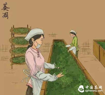 散失鮮葉中一部分水分。在走水過程中有一些香氣物質(zhì)形成,部分大分子酯容性糖水解為小分子可容性糖。