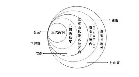 從文獻(xiàn)記載來(lái)看,武夷山很早以前就存在著基于茶樹生長(zhǎng)的自然環(huán)境而對(duì)茶葉進(jìn)行的分類,茶有“巖”、“洲”、“外山”之分。“茶,諸山皆有,溪北為上,溪南次之,洲園為下。”在山上者為巖茶,水邊者為洲茶,武夷山之外者為外山茶。而“巖茶”又可進(jìn)一步分為“大巖茶”、“中巖茶”及“半巖茶”。 據(jù)陸羽《茶經(jīng)》載:“種茶的土壤,以雜有爛石為最好,其次為沙質(zhì)的土壤,黃土最差。”清代崇安縣令陸廷燦的《隨見錄》中寫到:“武夷茶在山上者為巖茶,水邊者為洲茶。巖茶為上,洲茶次之。巖茶,北山者為上,南山者次之。 ”清代文人劉埥在《片刻余閑集》中也有類似的巖茶、洲茶的劃分,并指出“凡巖茶,皆各巖僧道采摘焙制,遠(yuǎn)近賈客于九曲內(nèi)各寺廟購(gòu)覓,市中無(wú)售者。洲茶皆民間挑賣,行鋪收買”。 依據(jù)古籍文獻(xiàn)中的記載及如此市場(chǎng)上對(duì)商品武夷巖茶的分類,大致可以勾畫出以下的“武夷巖茶等級(jí)分布圖”。(以上摘自文獻(xiàn))