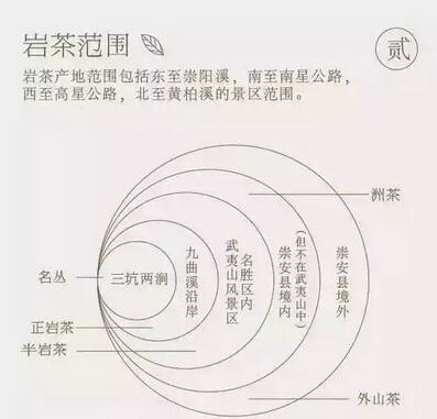 按國標來講,巖茶產(chǎn)地范圍包括東至崇陽溪,南至南星公路,西至高星公路,北至黃柏溪的景區(qū)范圍。按流行的山場觀點,武夷巖茶依生態(tài)條件分為正巖茶、半巖茶和洲茶,外山茶。其中正巖區(qū)號稱巖巖有茶,其中三坑兩澗最為著名,其余坑澗也是各有特點。