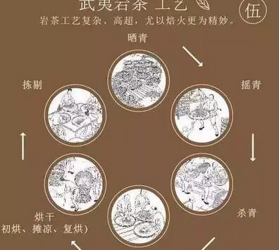 傳統(tǒng)武夷巖茶工藝,大致分為:曬青→(涼青、搖青)→殺青→揉捻→烘干(初烘、攤涼、復烘)→毛茶(撿剔)。
