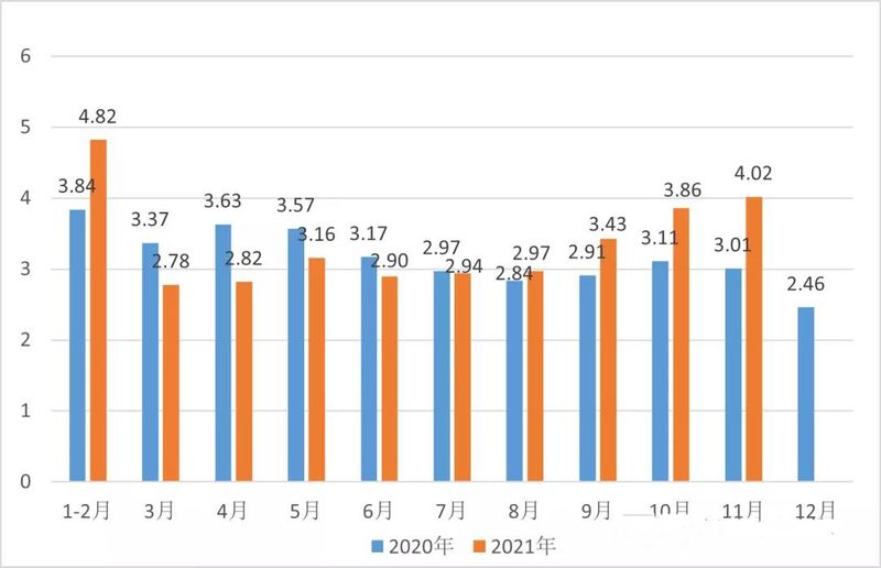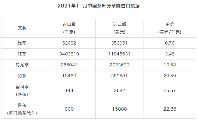 據(jù)中國海關(guān)數(shù)據(jù),2021年11月,中國茶葉進(jìn)口量為3730.8噸,進(jìn)口額為1532.5萬美元。1-11月,中國茶葉累計進(jìn)口量為42651.3噸,累計進(jìn)口額為16773.8萬美元。