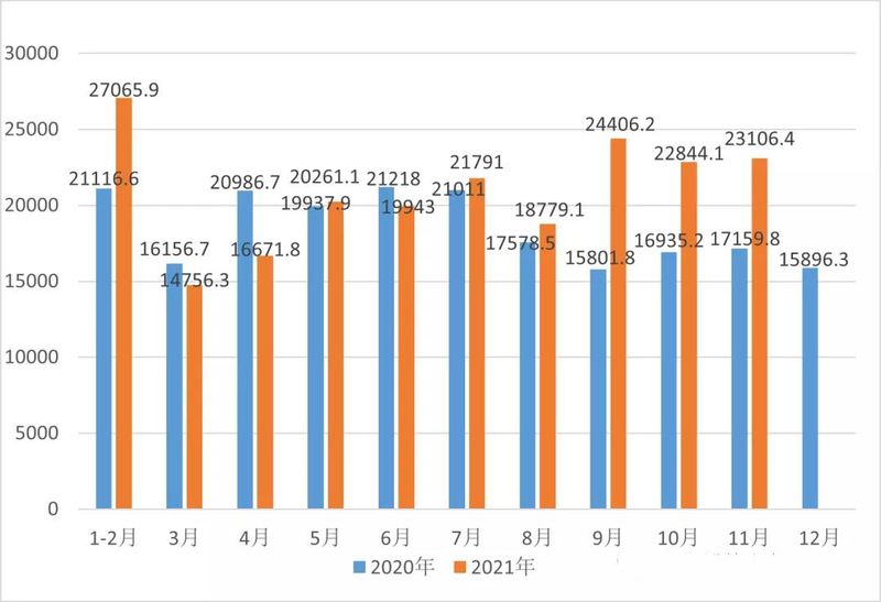 2020-2021年各月中國茶葉出口額比較 (單位:萬美元)