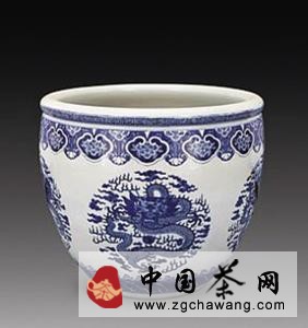 作用一樣,都是用以貯水烹茶的。水瓶,修頸垂肩,平底,有提柄,素瓷青花者最好。也有一種束頸有嘴,飾以螭龍,名叫螭龍樽的也不錯。水缽,也是用來貯水以備烹茶的,大小均相等于一個普通花盆,款式也很多。明代制的“紅金彩”,用五金釉,描金魚二尾在缽底,舀水時水動,好像金魚也動,這是很少見的珍品。