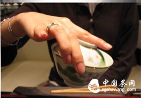 蓋微傾鈄留一線空隙,母指中指及無名指抓住飄口的碗邊,食指屈曲表地按著蓋頂圈內(nèi)。