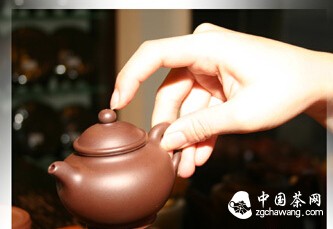 先用中指與母指夾于把壺頂,再用無名指頂卡壺把之后,再屈曲食指按于壺鈕即可。