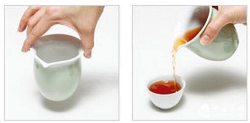 第一張圖是錯誤的示范,如果大拇指與食指輕捏茶海邊緣,很容易在傾倒茶水時被蒸汽燙到,或者沾染到茶水,不衛(wèi)生也不禮貌。