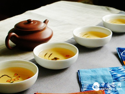 這里所說的桌面效果往往是指桌巾而言,利用桌巾強烈的色彩、圖案與造形(如利用騎巾與小方塊布造成的效果),吸引與會者的注意,或是突破掉周遭不協(xié)調的場景。當然也可以利用桌巾或桌面的處理來加強茶具的視覺效果,如桌子與茶具都是深色或都是淺色,就可以利用桌巾的顏色將茶具突顯出來。