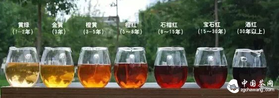 新茶期:黃綠(1-2年)、金黃(3年)、橙黃(3-5年)。